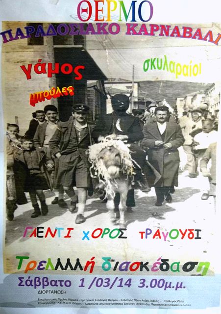 Το Σάββατο 1 Μαρτίου 2014 διάφοροι Πολιτιστικοί φορείς του Θέρμου, ενώνουν τις δυνάμεις τους, το γούστο, το μεράκι και τις μνήμες των παληότερων, σε μιά προσπάθεια αναβίωσης του Καρναβαλιού, όπως γινόταν τα παληά χρόνια.